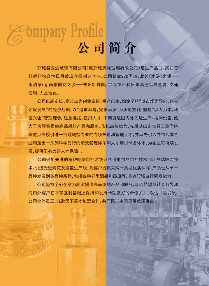 鄆城縣安迪玻璃有限公司是一家生產玻璃酒瓶及綜合性日用玻璃容器制造公司,緊靠220國道,北鄰《水滸》之源----水泊梁山;南依國花之鄉----曹州牡丹園;京九鐵路和日東高速縱橫全境,交通便利,人杰地靈。